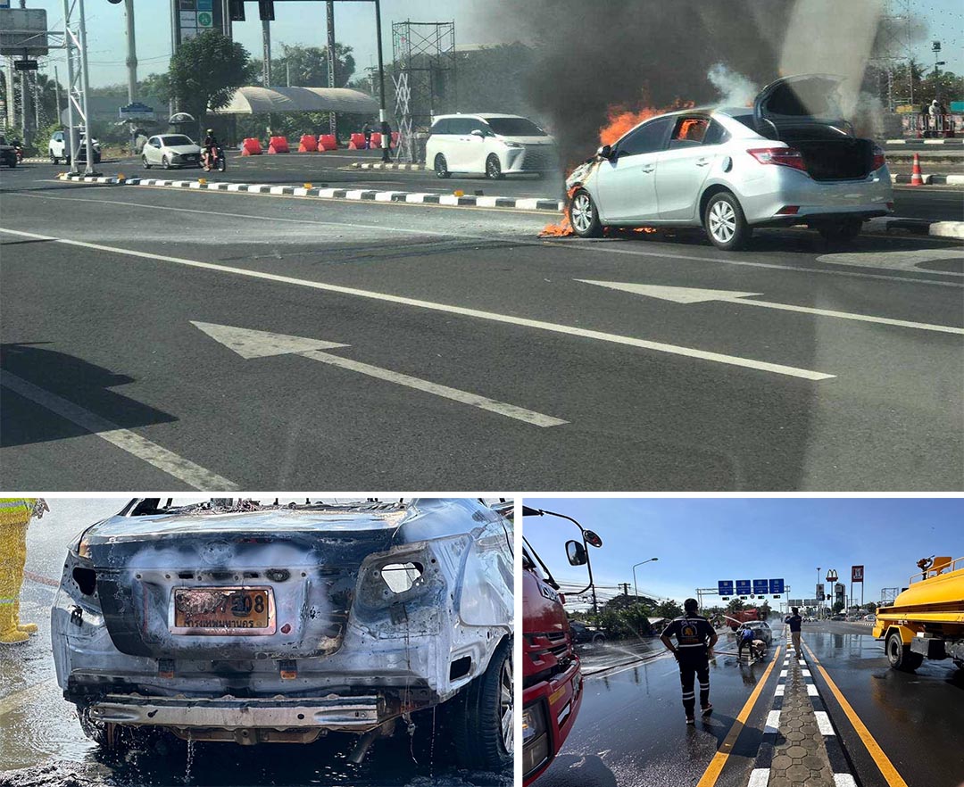 ระทึก!ไฟลุกพรึบรถนักท่องเที่ยวอินโดฯ หน้าสนามช้างบุรีรัมย์สรุปวอดทั้งคัน
