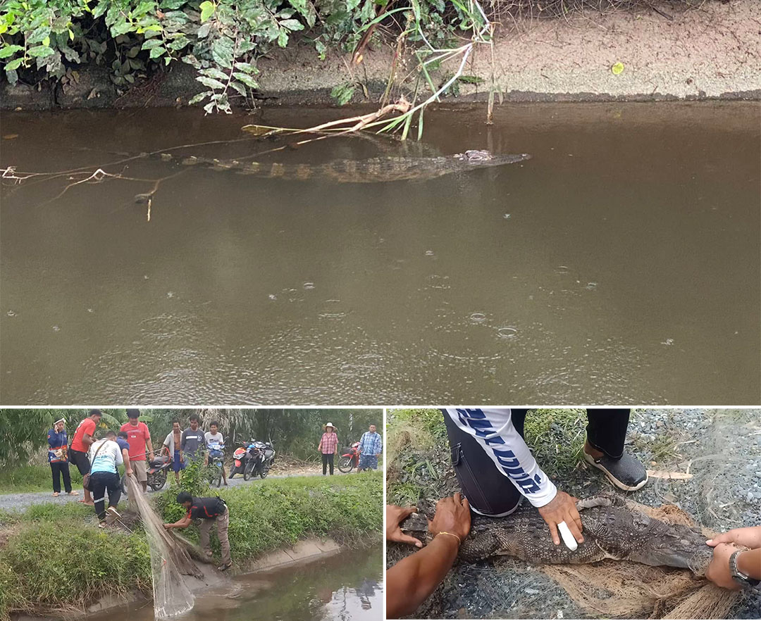นครปฐม-ชาวบ้านตำบลตาก้องผวาซ้ำ เด็กในชุมชนเห็นจรเข้ลอยคอในชุมชนต้องเรียกผู้ใหญ่บ้านประสานกู้ชีพมาช่วยกันจับโดยสามารถจับจ...