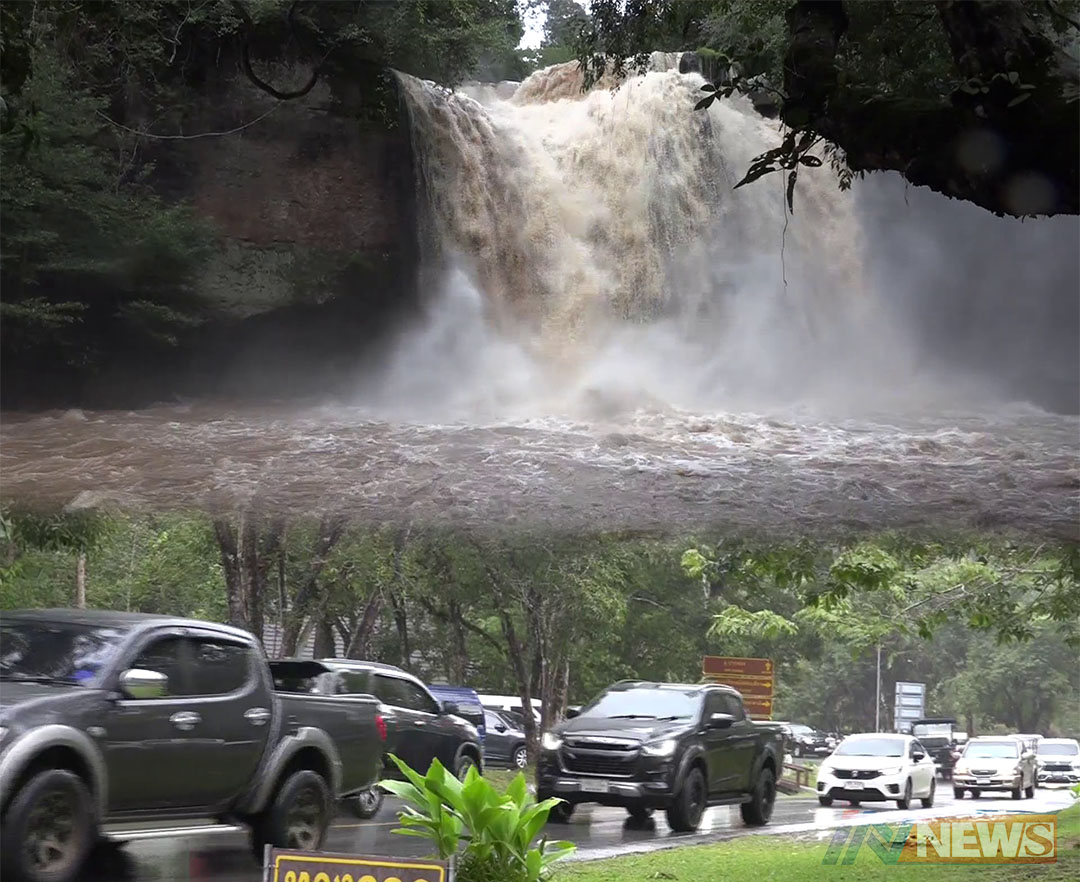 เขาใหญ่มีฝนตกหนักน้ำไหลลงลำตะคอง สะพานข้ามหมูสีน้ำล้นผลดีเติมน้ำในเขื่อน