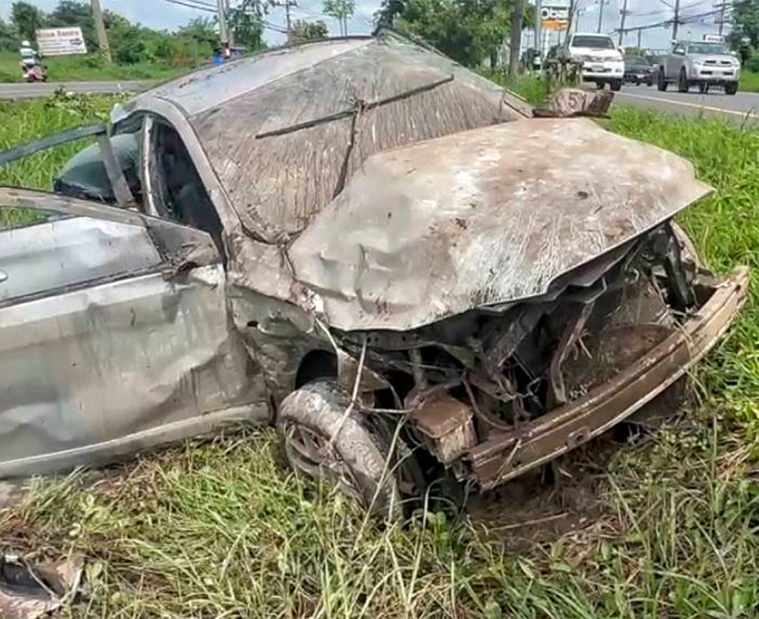 รถเก๋งพลิกคว่ำหลายตลบตกลงข้างทาง รถเสียหายทั้งคันมีผู้บาดเจ็บ2ราย