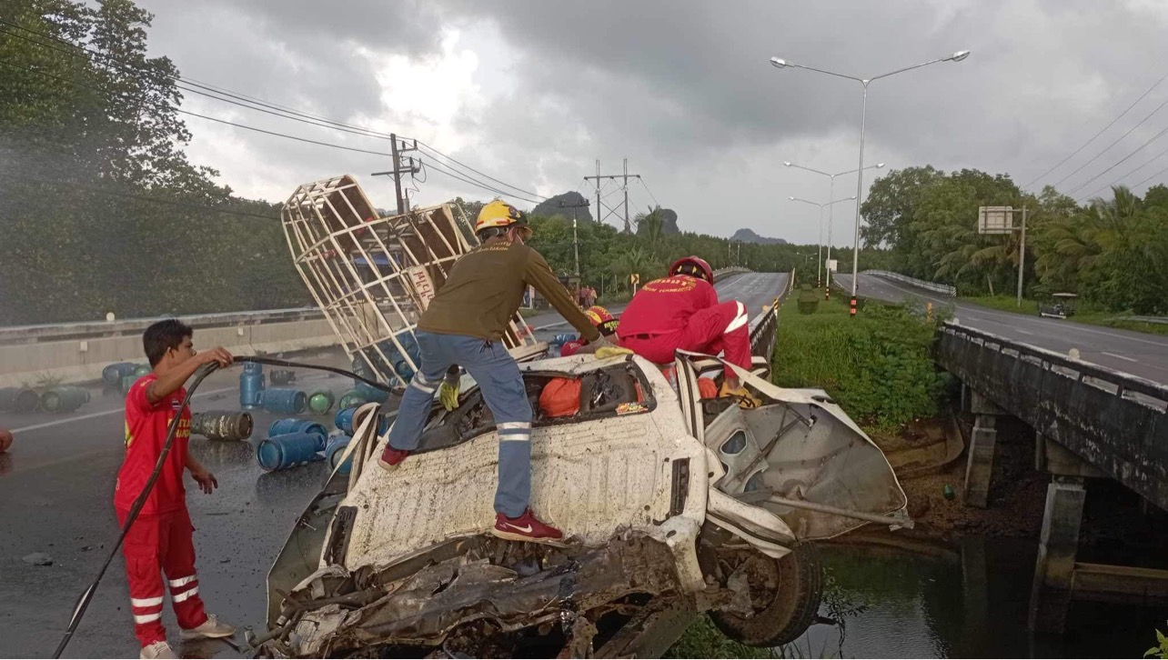 กระบะส่งแก๊สพังงาหลับในพุ่งชนสะพาน ดับคาที่ถังแก๊สกระจัดกระจาย