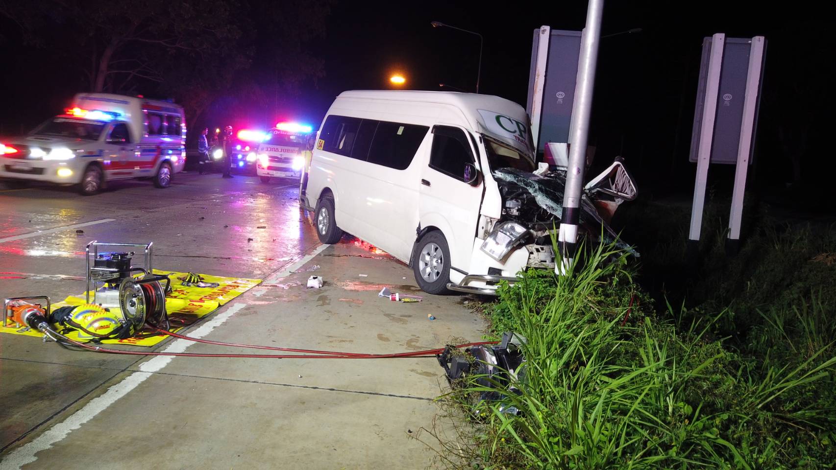 ถนนสไลเดอร์ท่าถ่านแผลงฤทธิ์รับฤดูฝน รถตู้ขนแรงงานต่างด้าวชนเสาไฟเจ็บ16