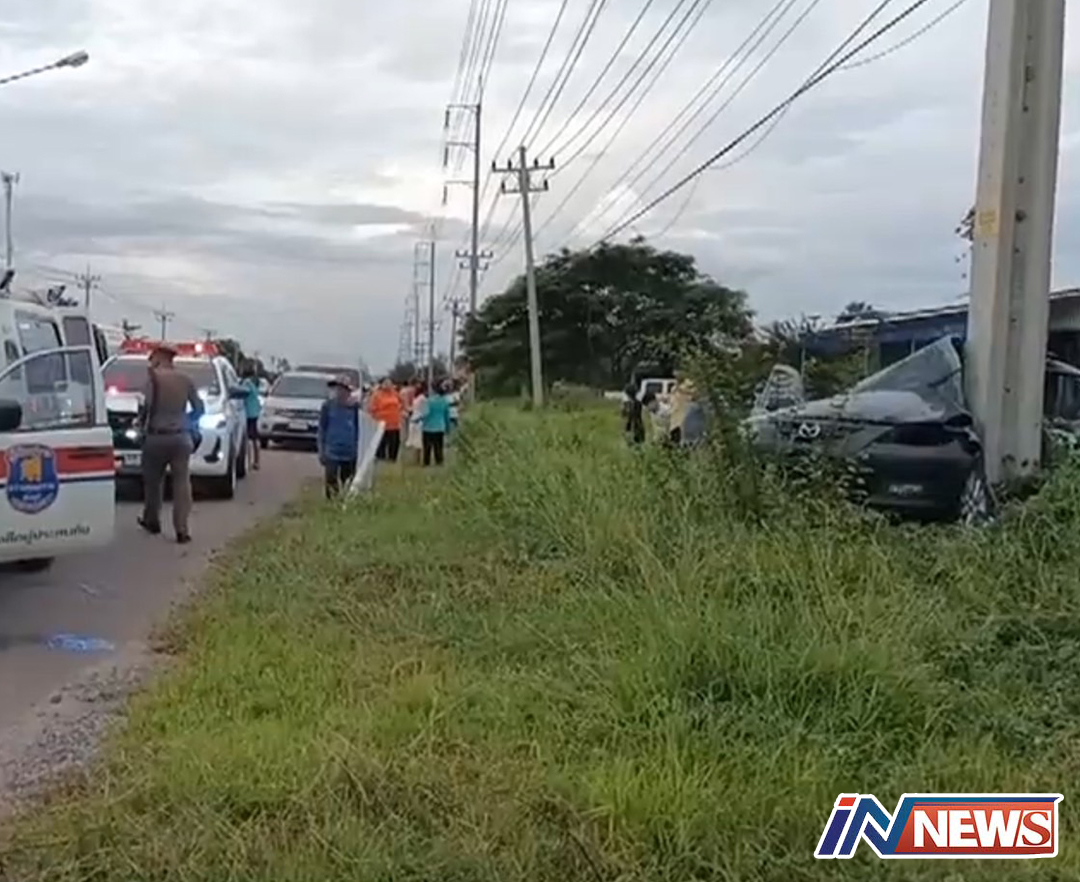 หนุ่มใหญ่ซิ่งเก๋งไปรับเมียเสียหลักชนเสาไฟฟ้าแรงสูงพังยับดับ