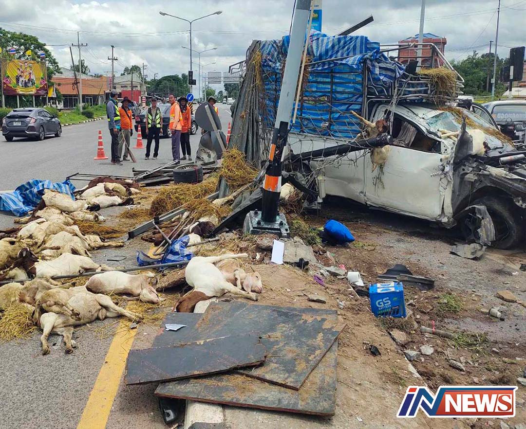 ระทึกกระบะบรรทุกแพะเบรกแตกอัดเสาไฟจราจรตายเกือบยกคัน