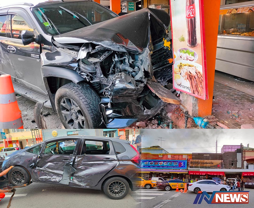 หนุ่มใหญ่ตกใจ!ไฟท้ายรถคันหน้าหักหลบ พุ่งขึ้นร้านค้าชนยับ5คันที่จุดพักรถเขาดิน