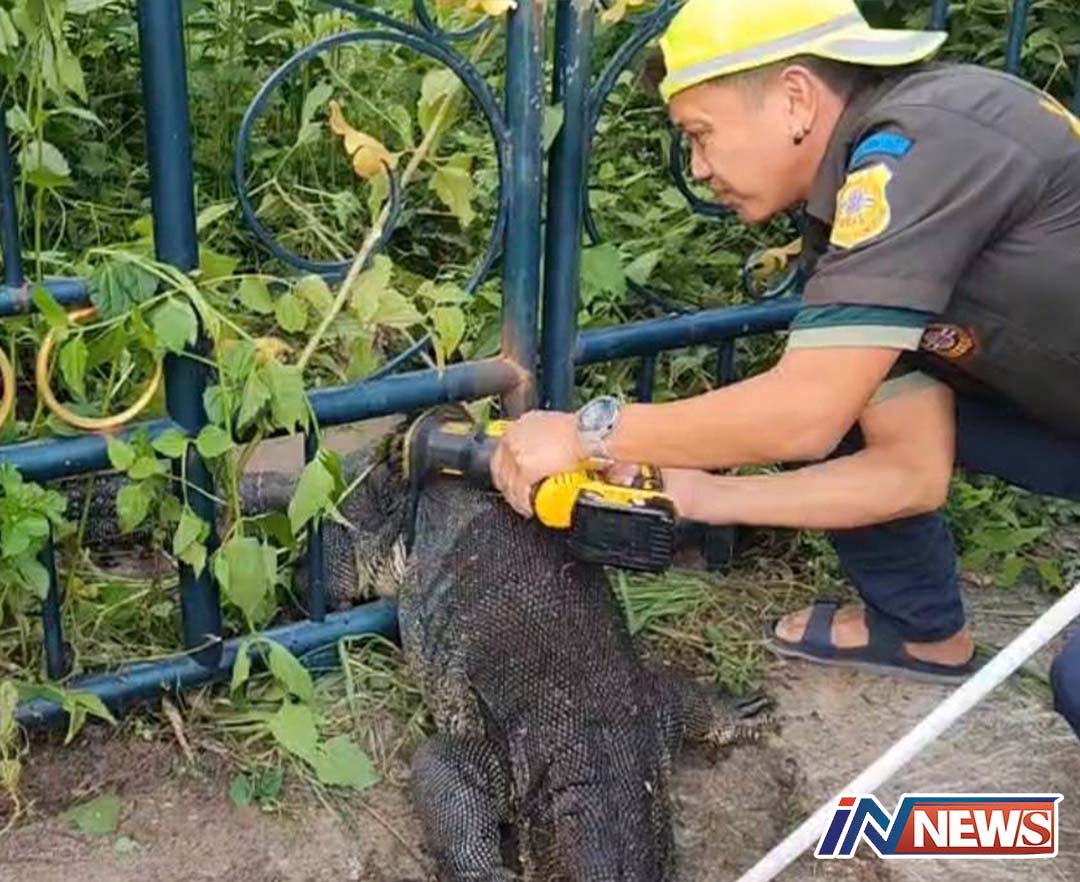 นครนายก-ตัวเงินตัวทองอ้วนขนาดใหญ่ลำตัวติดประตูรั้วโกดังร้าง โชคดีชาวบ้านผ่านมาเห็นแจ้งกู้ภัยให้มาช่วยได้ทันในสภาพหมดแรง