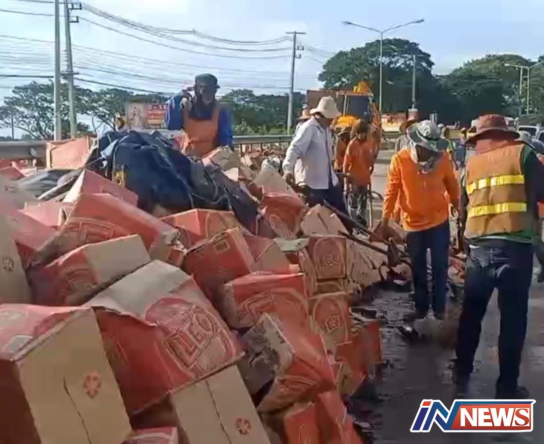 รถบรรทุกเบียร์ดังเทกระจาดเบียร์2.5พันลังเสียหาย