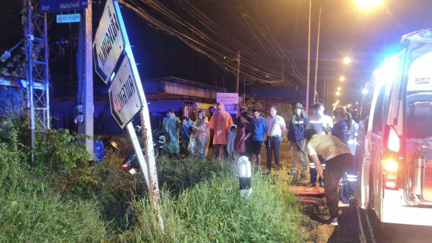 ฝนตกถนนลื่นหนุ่มขี่จยย.ฝ่าสายฝนไถล ชนป้ายหมู่บ้านพุ่งข้ามคลองพาดเสาดับ