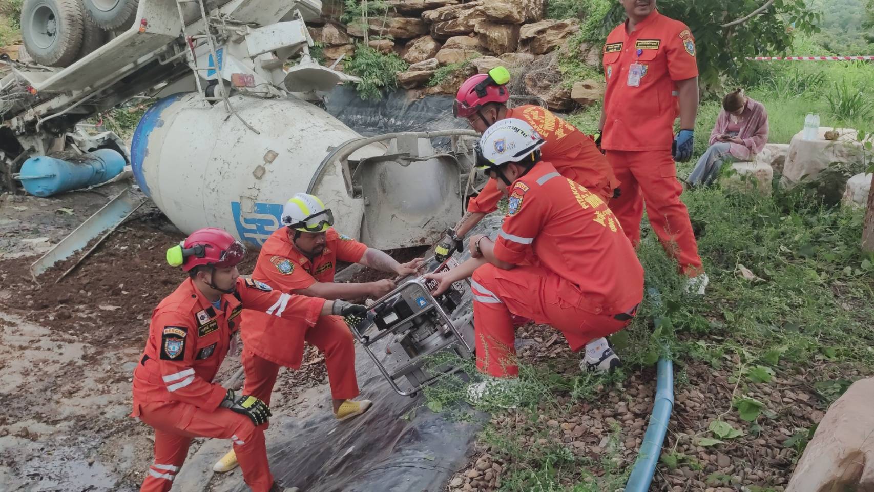 รถโม่ปูนลมเบรคหมดพุ่งตกเขาสูง11เมตร คนขับดับสลด!!