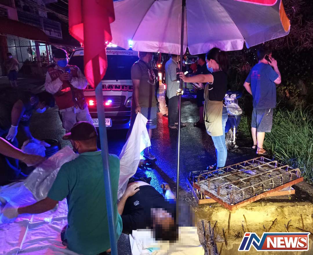นครปฐม-สลด พนักงานโรงงานผลิตหม้อแปลงไฟฟ้าเลิกงานช่วงหัวค่ำ ขี่ จยย.กลับบ้านช่วงฝนตก ถึงที่เกิดเหตุไม่เห็นทางตกหลุมชนฝาท่...