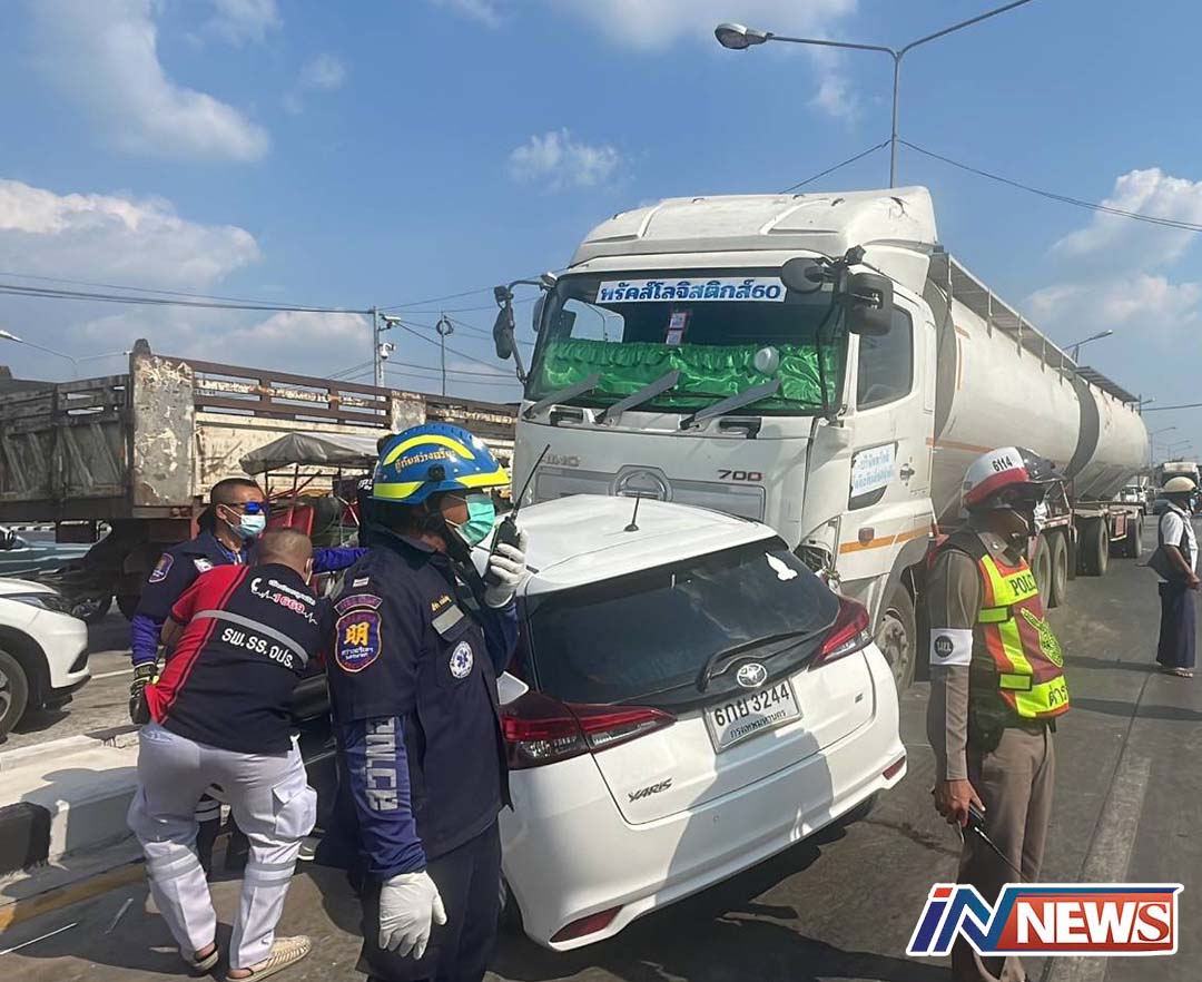 นครนายก-ยักษ์ใหญ่รถบรรทุกพ่วง18ล้อ เบรกไม่อยู่ฝ่าไฟแดงชนเก๋งจิ๋วยาริสติดหน้ารถ ลากยาวกว่า 50 เมตร กู้ภัยเร่งช่วยเหลือผู้...