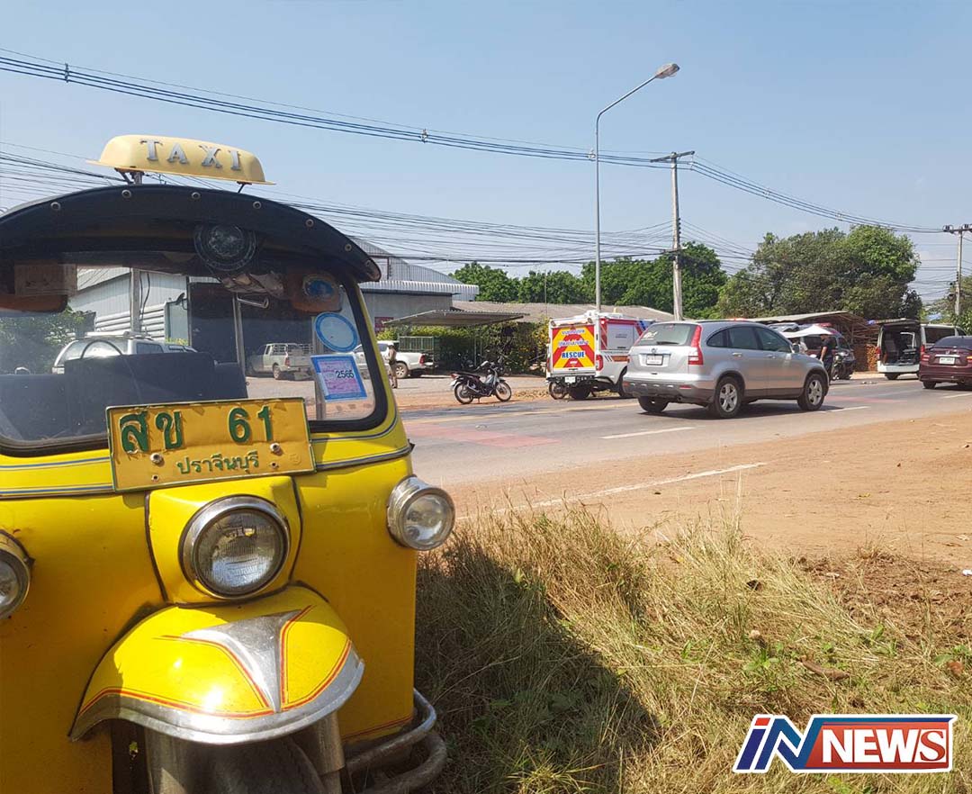 ปราจีนบุรี-ระวังภัย รถสามล้อตุ๊กวิ่งลากกันมาซ่อมคันหลัง เหยียบเชือกที่ลากจูงจนเสียหลักคนขับกระเด็นตกลงบนถนนนอกรถไปเลนตรง...