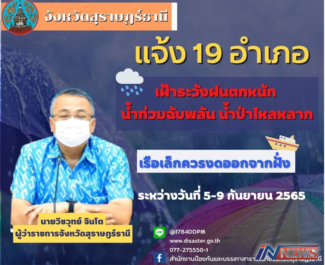 สุราษฎร์เตือน5-9ก.ย.ระวังฝนตกน้ำท่วม เตือนคลื่นแรงเรือเล็กงดออกฝั่ง