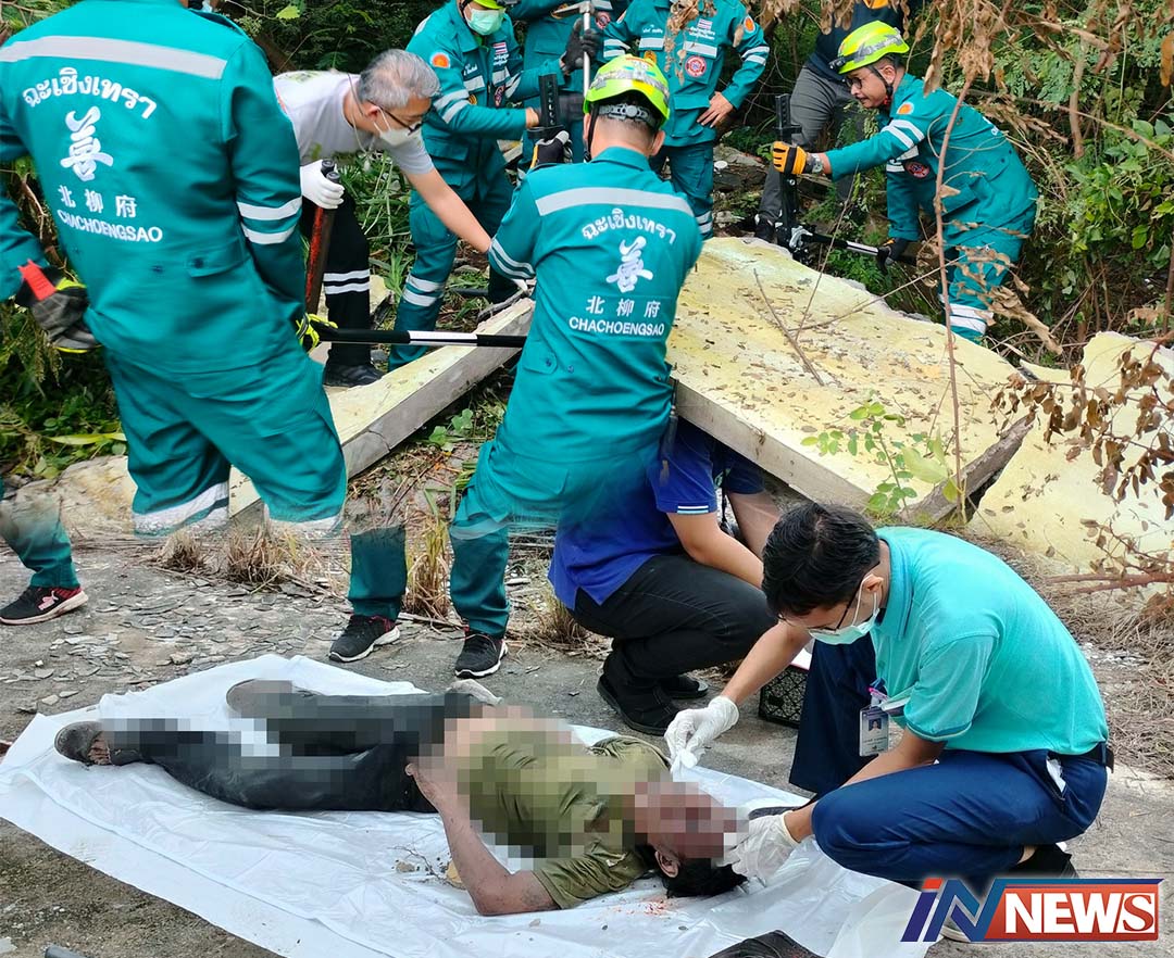 ฉะเชิงเทรา-หนุ่มเก็บของเก่า เดินสายทุบเอาเหล็กเส้นจากเสาโครงสร้างตึกร้าง ถูกกำแพงล้มลงมาทับดับอนาถคาที่ หลังหายหน้าขาดกา...