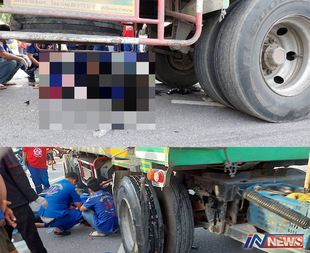 18ล้อพ่วงทับหัวสยองคาล้อ!หนุ่มยางม่วง หลังขี่จยย.ชนท้ายก่อนหลุดเข้าล้อ