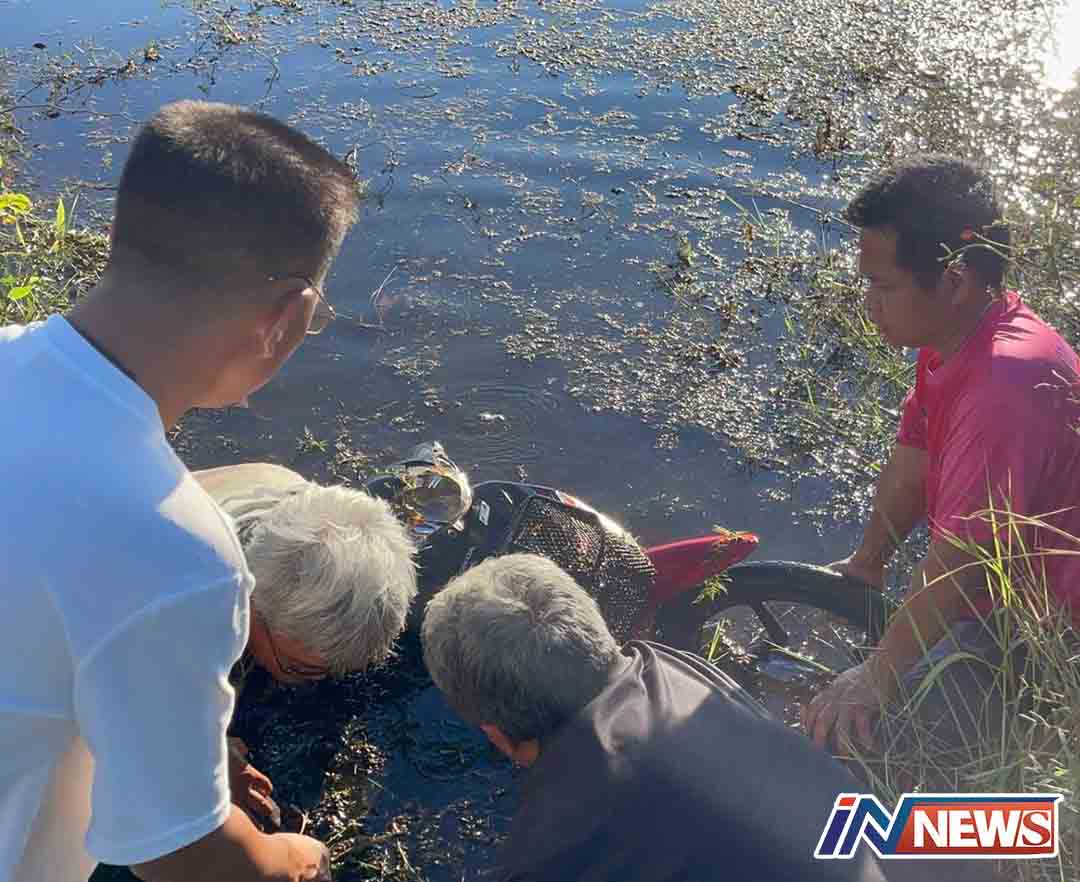 หนุ่มหาปลาเจอรถจักรยานยนต์จมน้ำรีบแจ้งตำรวจตรวจสอบ