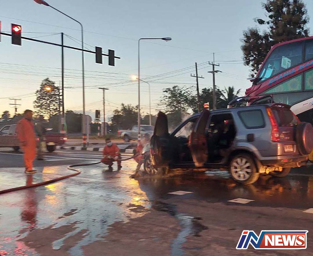 มุกดาหาร -เกิดเหตุไฟไหม้รถยนต์ขณะจอดติดไฟแดง สี่แยกบายพาสทางขึ้นวัดรอยพระพุทธบาทภูมโนรมย์ พยาบาลสาวหวิดดับ