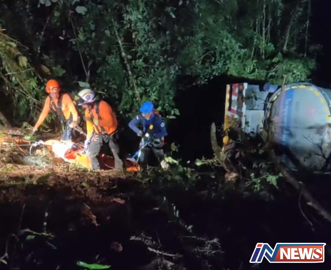 พังงา-สุดเศร้ารถเทรลเลอร์บรรทุกน้ำมันเต็มคัน เสียหลักแหกโค้งตกเหวลึกที่เขาสก กู้ภัยต้องโหนตัวลงไปกู้ศพคนขับขึ้นมา