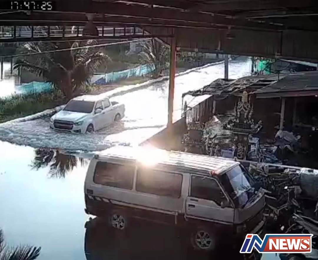 นครปฐม-กล้องวงจรปิดเผยภาพรถกระบะคันสีขาวคันหนึ่งขับฝ่าถนนบ้านคลองทองหลาง ที่มีน้ำท่วมและมีกระสอบทรายกันอยู่จนทำให้กระสอบ...