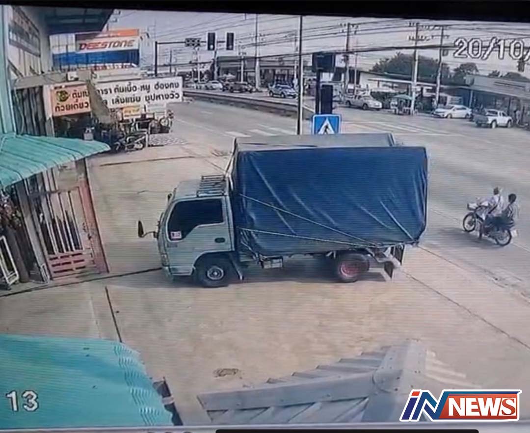 เผยภาพวงจรปิด จยย ประมาทถูกรถพ่วงเฉี่ยว หวิดดับ