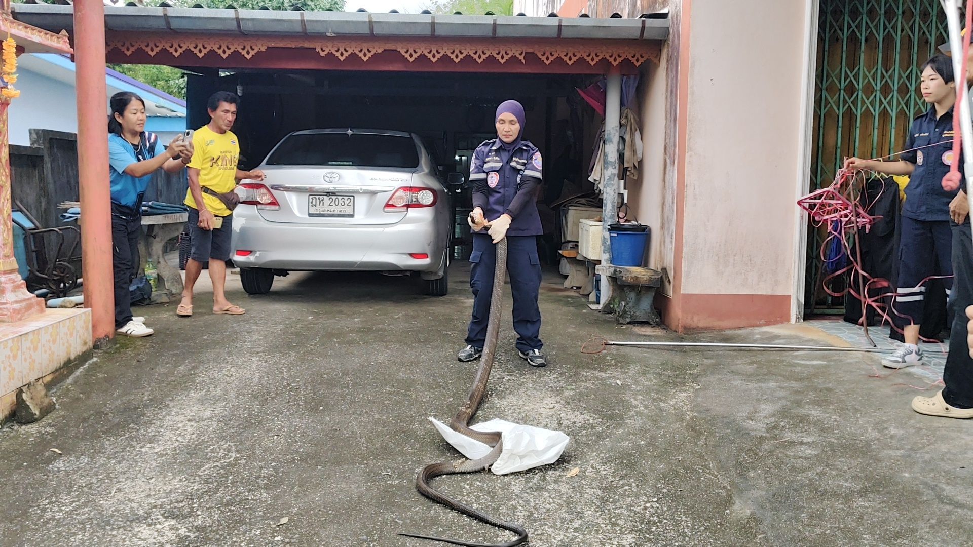 พังงา-ยายวัย 85 ปี ผงาดเจองูจงอางยาว 4 เมตร นอนใต้ตู้เสื้อผ้ากะว่าจะจับเองสุดท้ายงูตัวใหญ่เกินต้องเรียกกู้ภัยมาจับให้