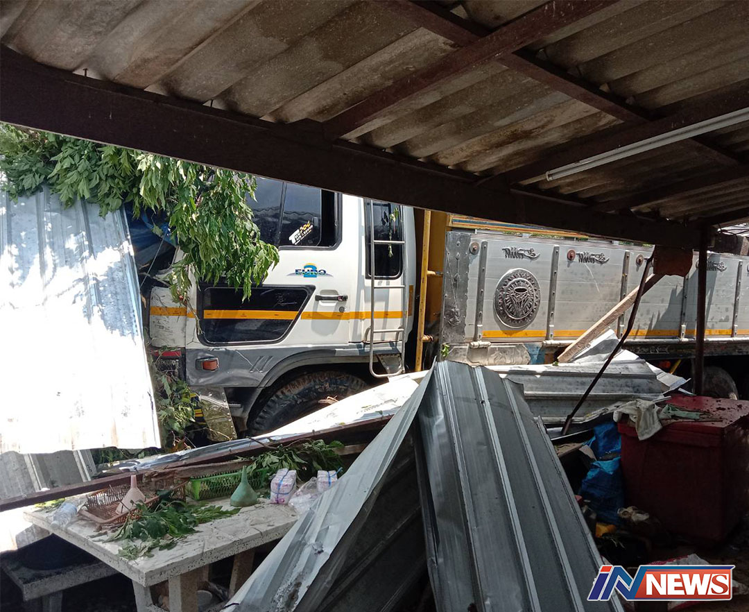 สิบล้อหลับในชนเสาไฟฟ้าหลุดพุ่งชนบ้าน เจ้าของรอดหวุดหวิด
