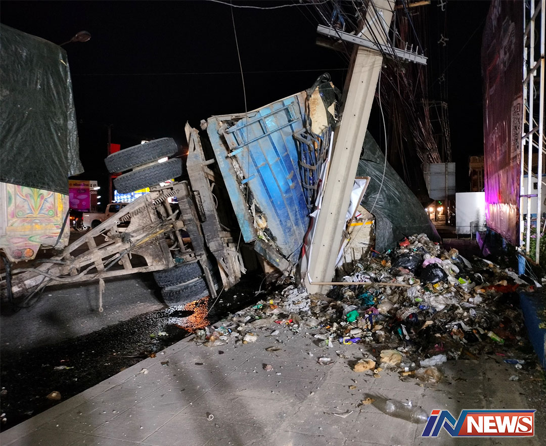 รถขนขยะกทม.เสียหลักพุ่งชนเสาไฟหัก ไฟดับ-รถติดทั้งแปดริ้ว/ขยะตกเกลื่อน