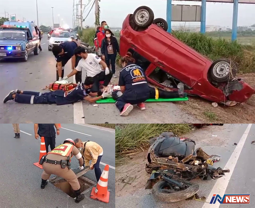 'ฝาท่อมฤตยู'เก๋งขับเลี้ยวเหยียบพลิกคว่ำ กระเด็นโดนจยย.ตกข้างทางเจ็บสาหัส