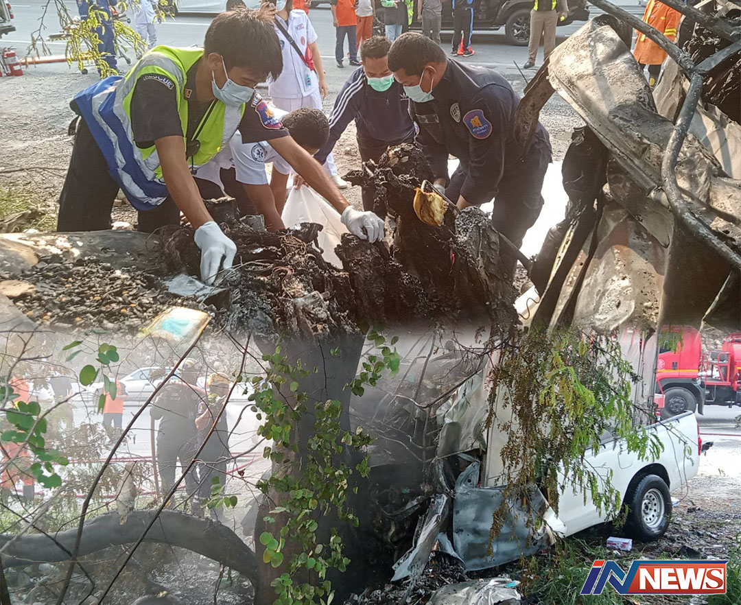 นครราชสีมา-รถกระบะตู้ทึบส่งอาหารแมวเสียหลักพุ่งชนต้นไม่ข้างทางก่อนเกิดไฟลุกท่วมคนขับถูกไฟคอกดับคารถ
