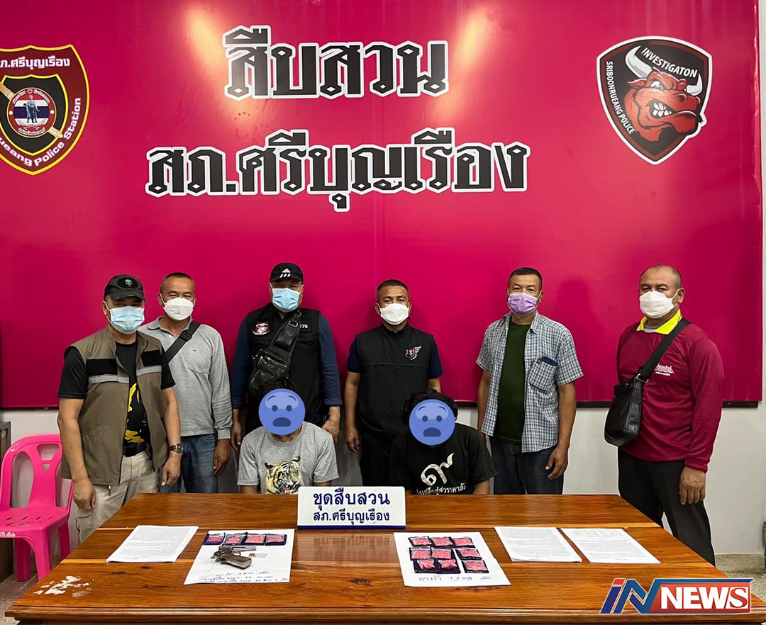หนองบัวลำภู-ตำรวจสภ.ศรีบุญเรือง รวบ 2 หนุ่มพกปืนพกยาบ้าเท่ห์ไม่นานเจอตำรวจศรีบุญเรืองยัดเข้าห้องขัง