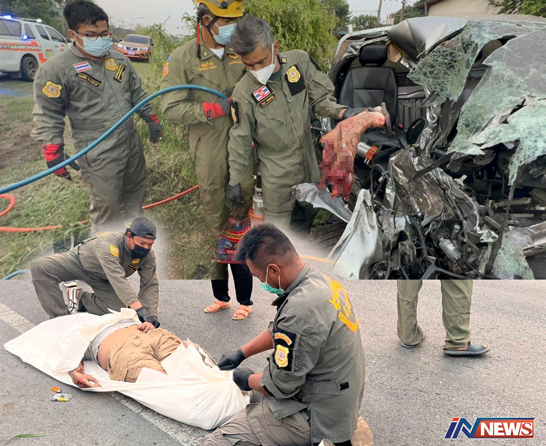 พ่อค้าหมูคาดหลับในขับรถจนเสียหลัก ตกข้างทางพุ่งชนต้นไม้ดับคาที