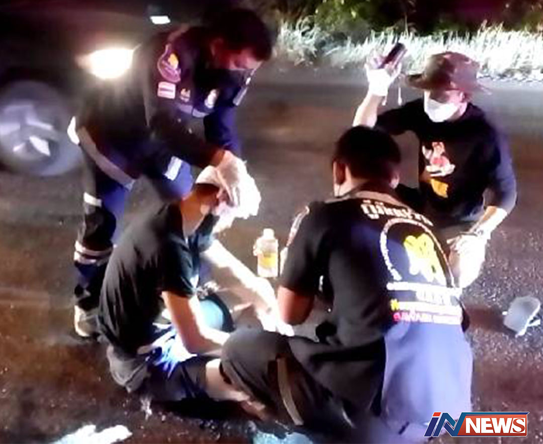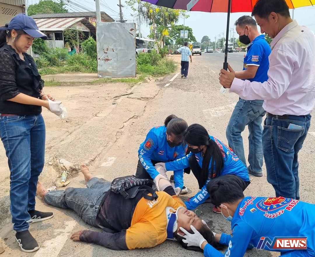 ร้อยเอ็ด-นายกเทศมนตรีตำบลหนองพอก ช่วยผู้ประสบอุบัติเหตุขี่รถจักรยานยนต์พุ่งชนแมว โชคดีคนเจ็บปลอดภัยสวมหมวกนิรภัย