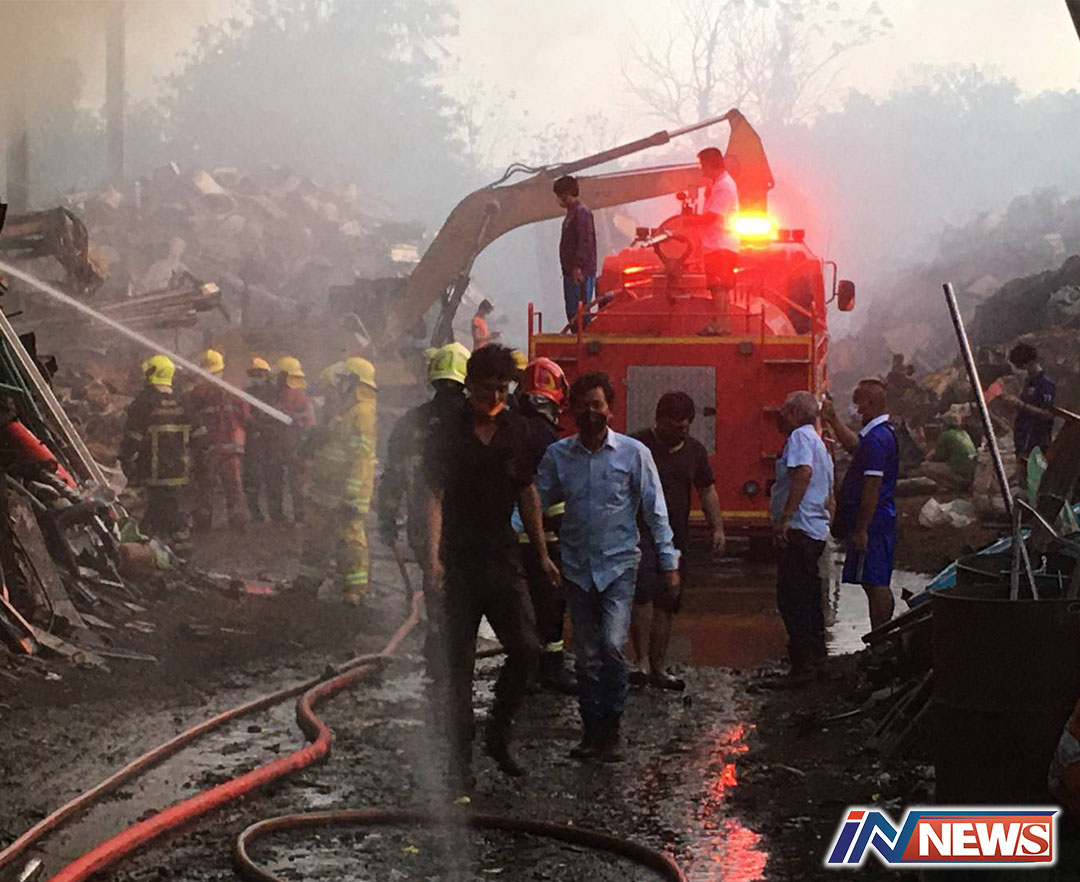 แม็คโฮทำงานตากแดงเกิดปะทุไฟไหม้ โกดังค้าของเก่ารถดับเพลิง10คันช่วยดับ