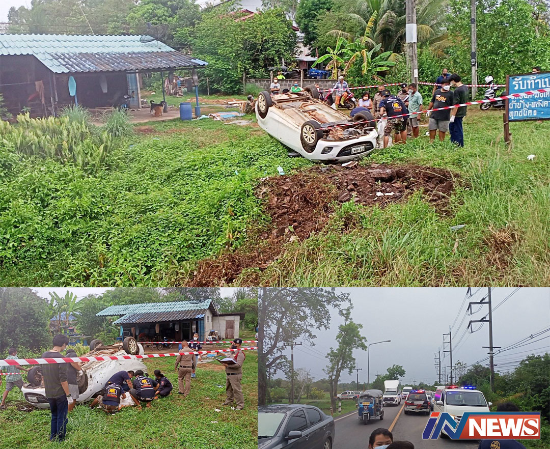 ระวังภัยฝนตกถนนลื่นรถเสียหลักพลิกคว่ำ เมียดาบตำรวจขับไปขายของดับคาที่