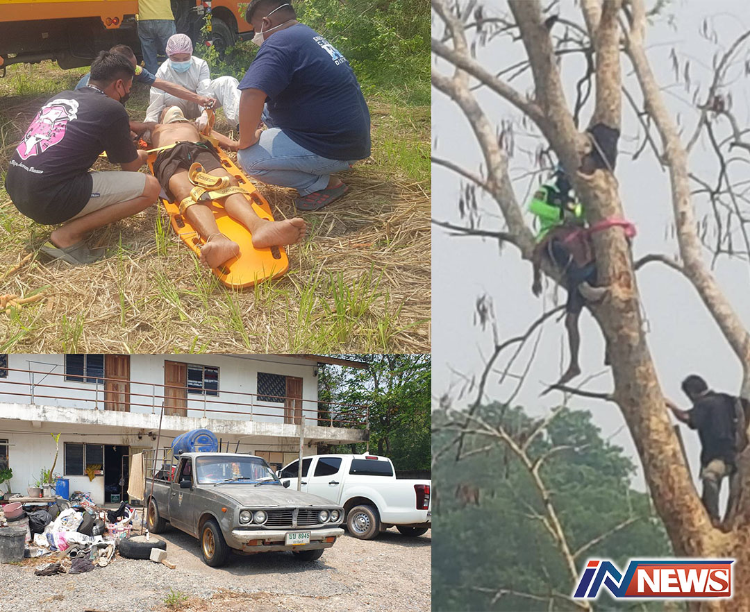หนุ่มเมียทิ้งหนีตามชายอื่นซดสุราทั้งคืน ปีนต้นไม้สูงใช้เสื้อผูกคอผ้าขาดหวิดดับ