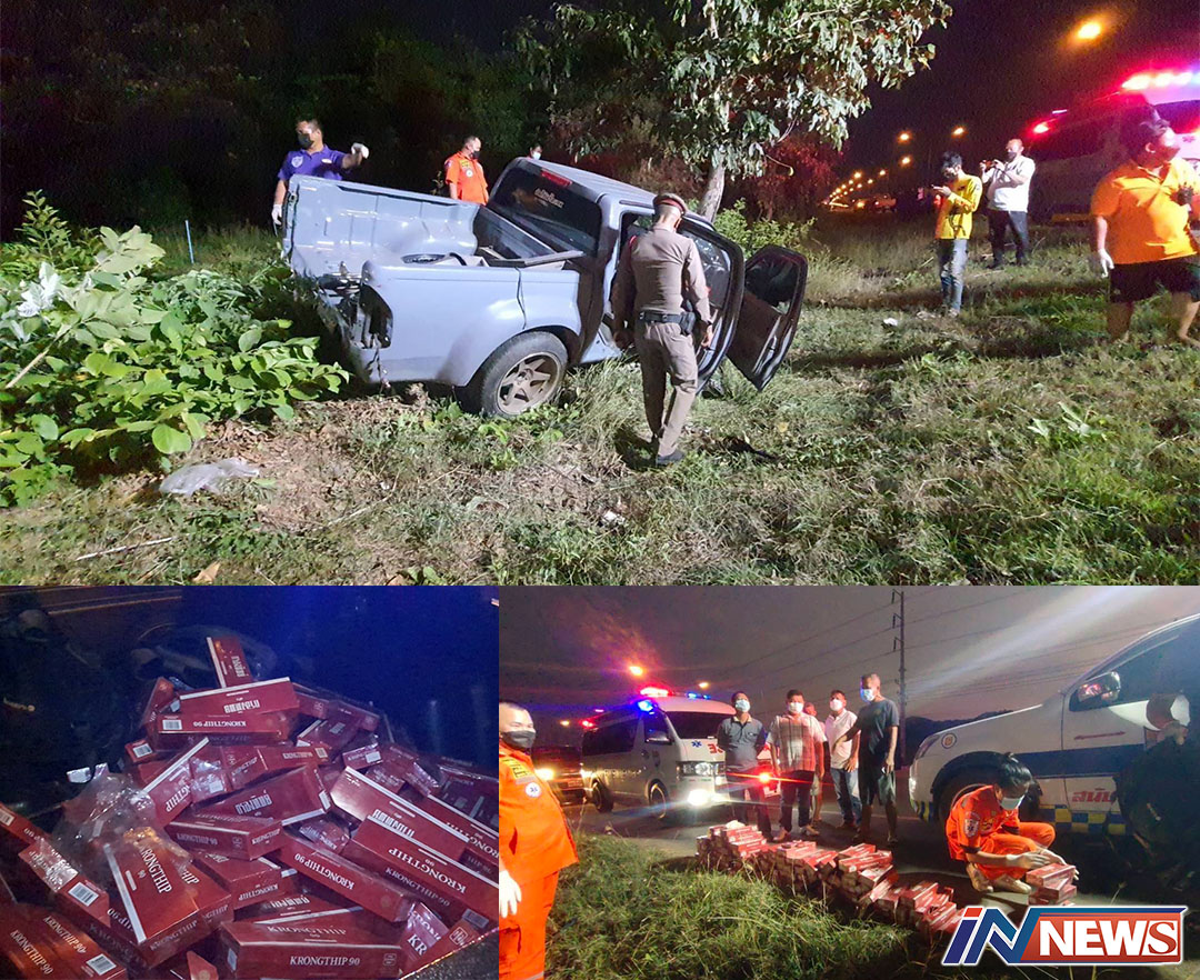 แก๊งขนขนบุหรี่กรองทิพย์เถื่อนส่งลูกค้า รีบจัดรถเสียหลักพุ่งชนต้นไม้หวิดดับ