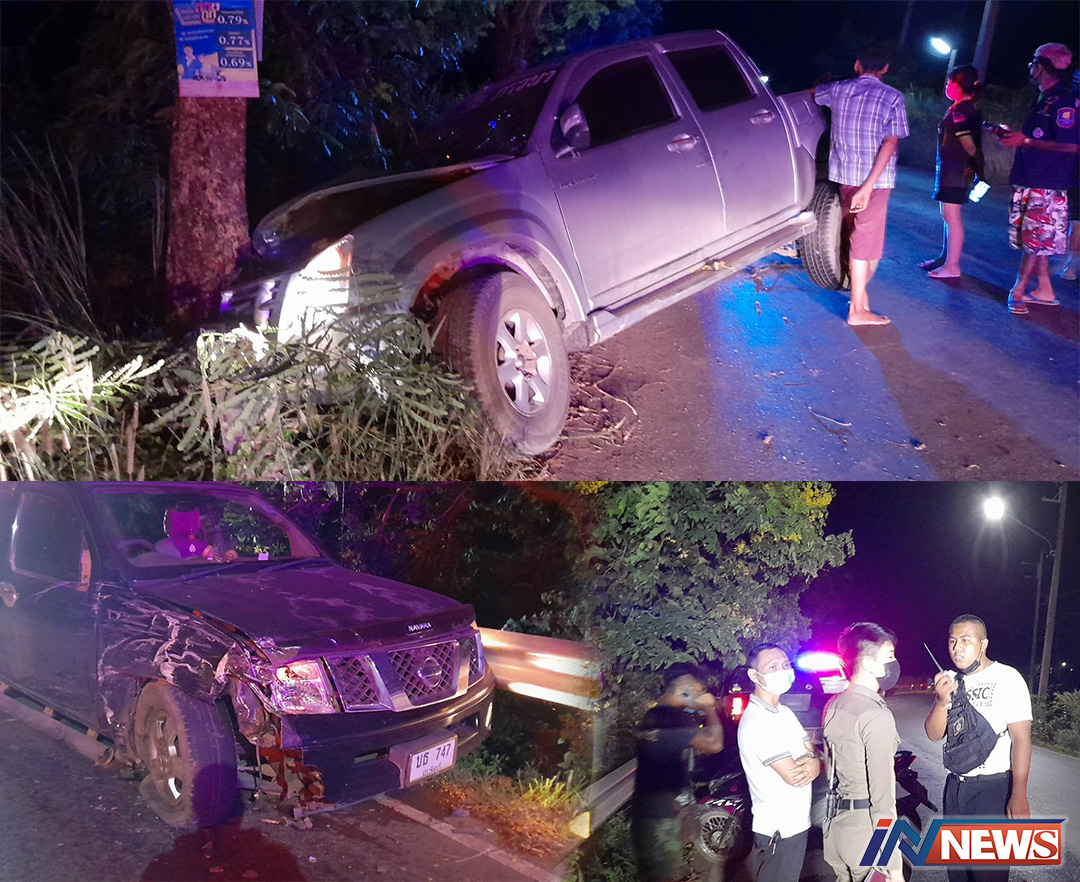 หนุ่มใหญ่ขับรถกระบะเสียหลักวิ่งหลุดโค้ง เฉี่ยวชนรถสวนทาง-หลบหนีไปต้นไม้ซ้ำ