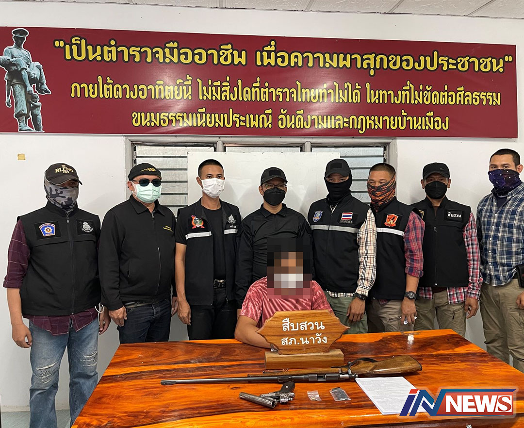 ตำรวจนาวังโชว์รวบผู้ต้องหาลักทรัพย์ ทำผิดพรบ.อาวุธปืน