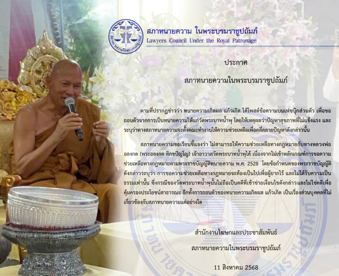 สภาทนายฯแจ้ง'ทนายเกิดผล'อ้างสภาฯ ทำคดีวัดพระบาทน้ำพุไม่จริงชี้ไม่เข้าข่าย
