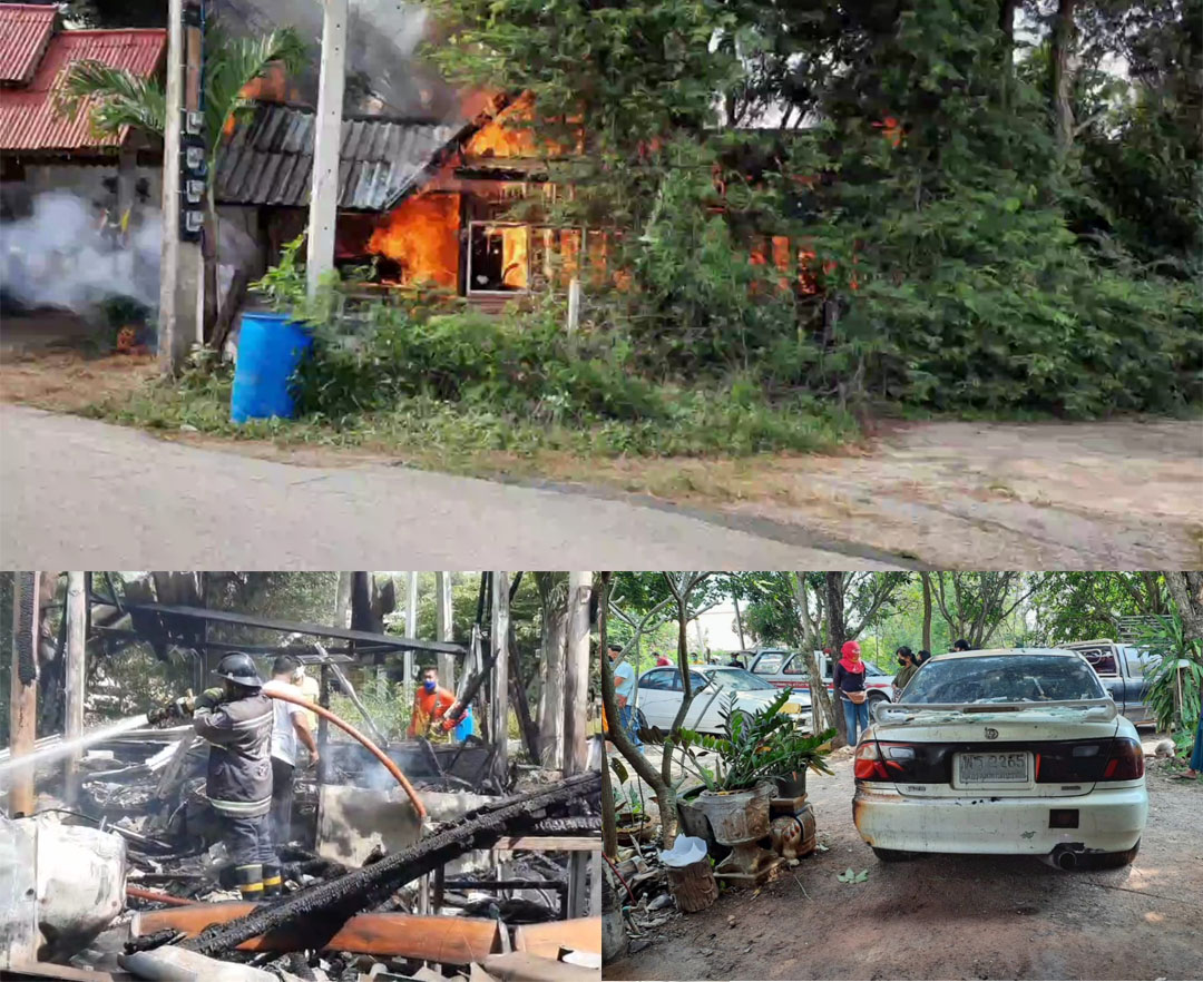 เพลิงไหม้บ้านไม้วอดทั้งหลังคนหนีทัน เผารถเก๋งอีกคันคาดเกิดไฟฟ้าลดวงจร