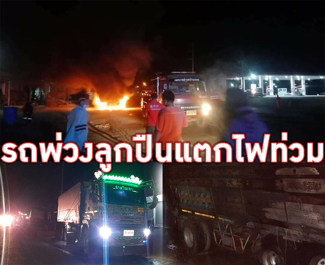 ไฟไหม้รถพ่วงสิบล้อขนหินวอดทั้งคัน เหตุลูกปืนแตกทำไฟลุกท่วม