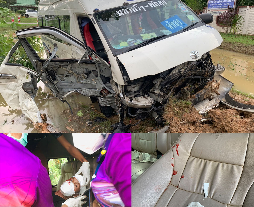 รถตู้โดยสารสายเมืองคอน-พัทลุงเสียหลัก กระบะปาดหน้าชนต้นไม้คนขับเจ็บ