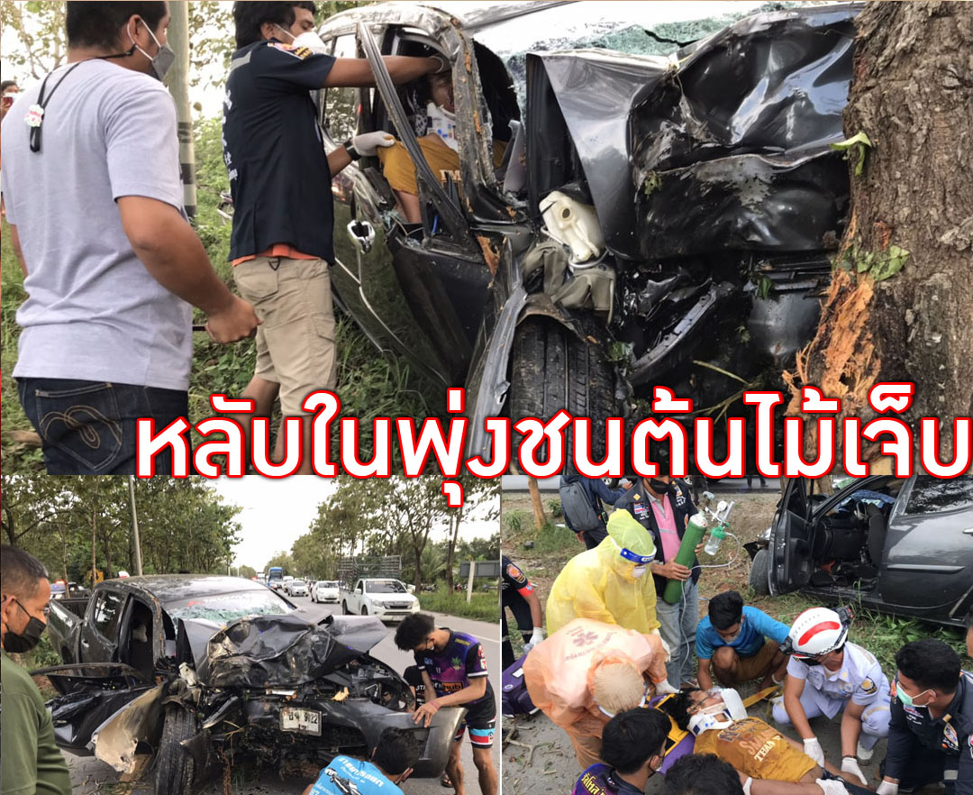 รถกระบะคาดหลับในเสียหลักพุ่งชนต้นไม้ ติดในรถได้รับบาดเจ็บ