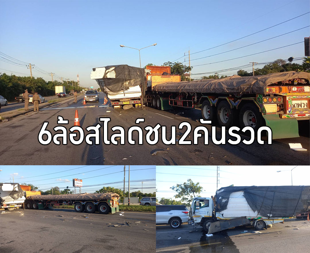 นครราชสีมา-กล้องหน้ารถจับภาพรถสไลด์ 6 ล้อขนโฟมเบรกไม่อยู่พุ่งชนเทรกกลางรถบรรทุกปูนเสียดังกระหึ่มโชคดีไม่มีผู้บาดเจ็บ