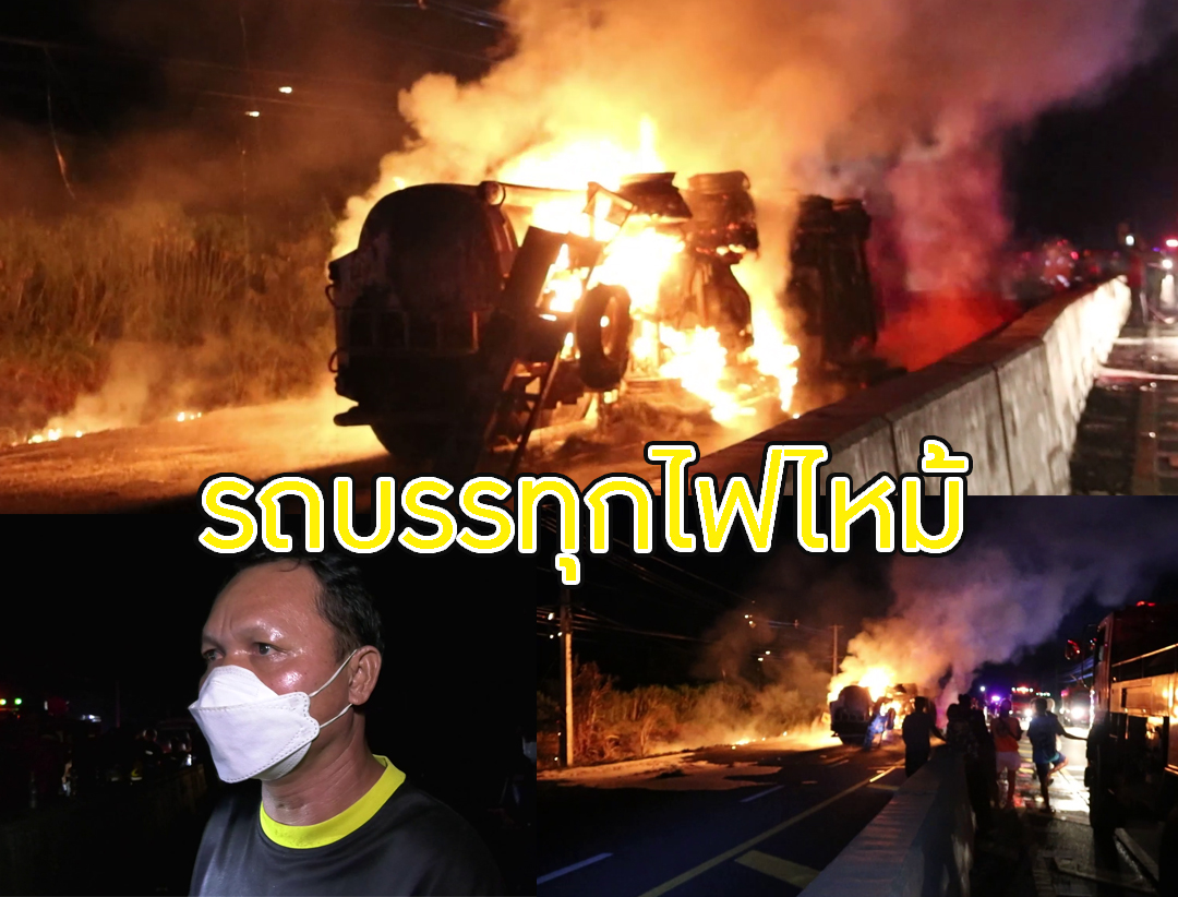 รถบรรทุกน้ำมันเสียหลักพลิกคว่ำไฟลุกพรึบคนขับรถหวุดหวิด