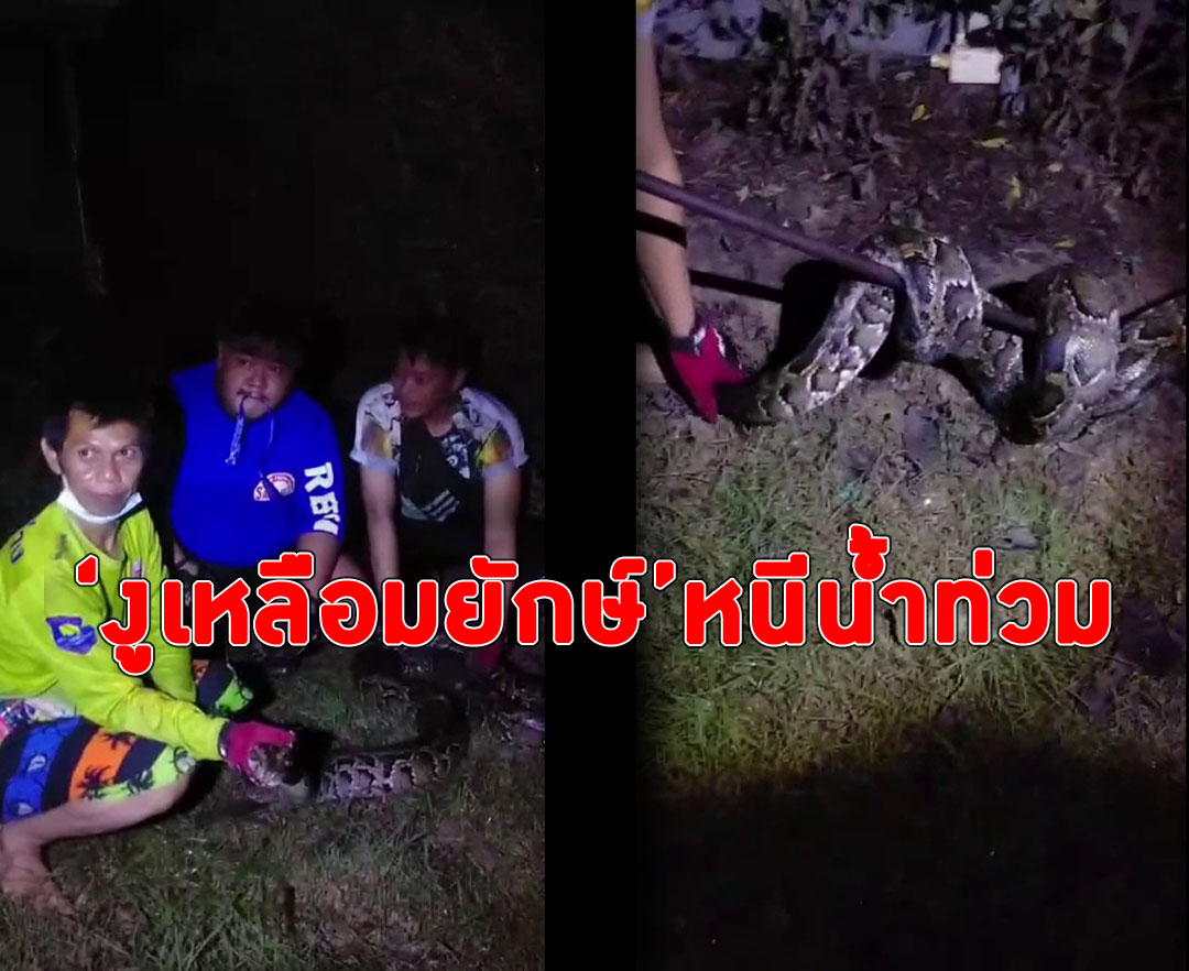 งูหลามหนีน้ำท่วมเขมือบหนูบนฝ้าเพดาน