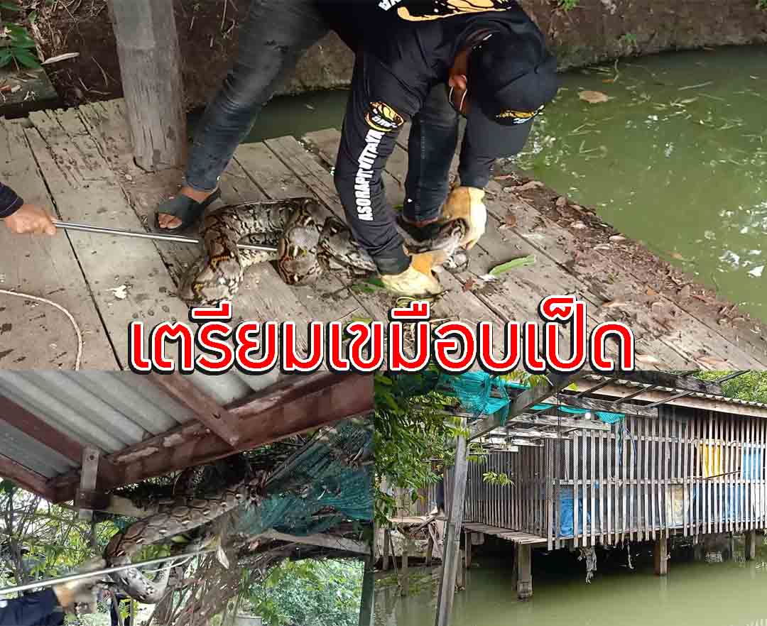 นครปฐม - หนุ่มใหญ่ เร่งโทรตามทีมปราบอสรพิษ บางเลน ช่วยจับงูเหลือมยาว 4 เมตรขณะกำลังเลื่อยบนขื่อศาลาหวังเขมือบเป็ดใ...