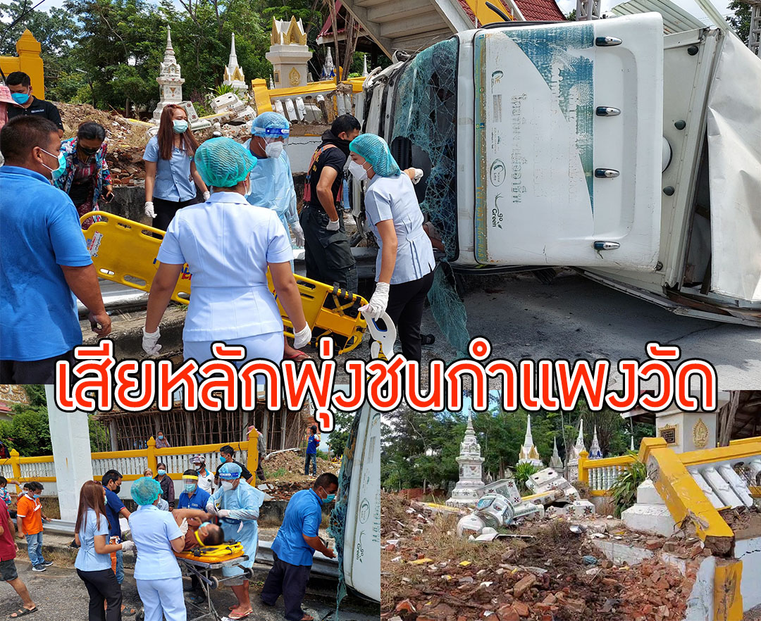 นครราชสีมา - รถขนแผงโซล่าเซลล์ขึ้นแซงรถบัสเสียหลักยางแตกพุ่งข้ามเกาะกลางถนนชนกำแพงวัดบาดเจ็บ 3 ราย