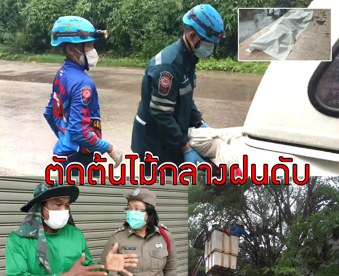 หนุ่มรับจ้างตัดต้นไม้กลางฝนพลาดท่ากิ่งไม้ พาดสายไฟแรงสูงช็อตคับคาต้นไม้