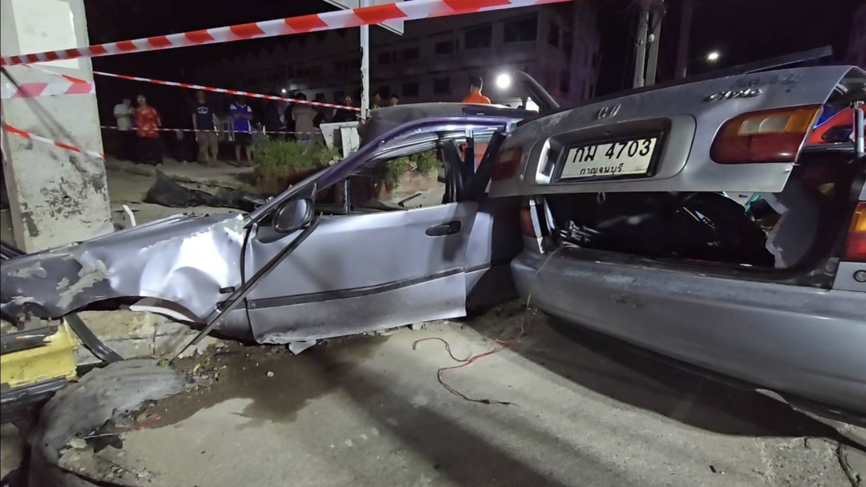 หนุ่มซิ่งรถแหกด่านตรวจตร.เมืองกาญจน์ แหกโค้งพุ่งชนเสาไฟฟ้าดับคาที่